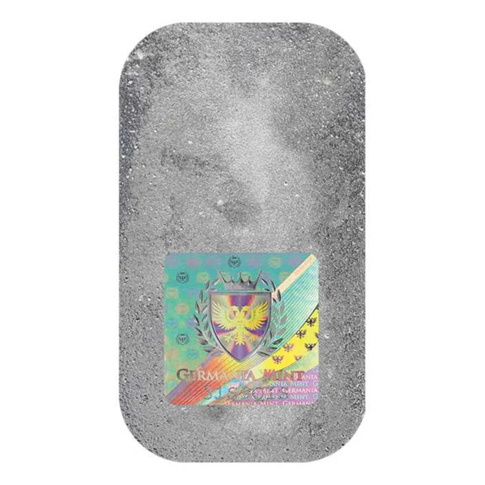 On the reverse field of 100 Gram Germania Cast Silver Bars, you will find a blank field. Cast silver bars often have designs on just one face of the bar. In the case of Germania Mint cast silver bars, all inscriptions are stamped incuse. This side of the bar does have a hologram element attached for security.