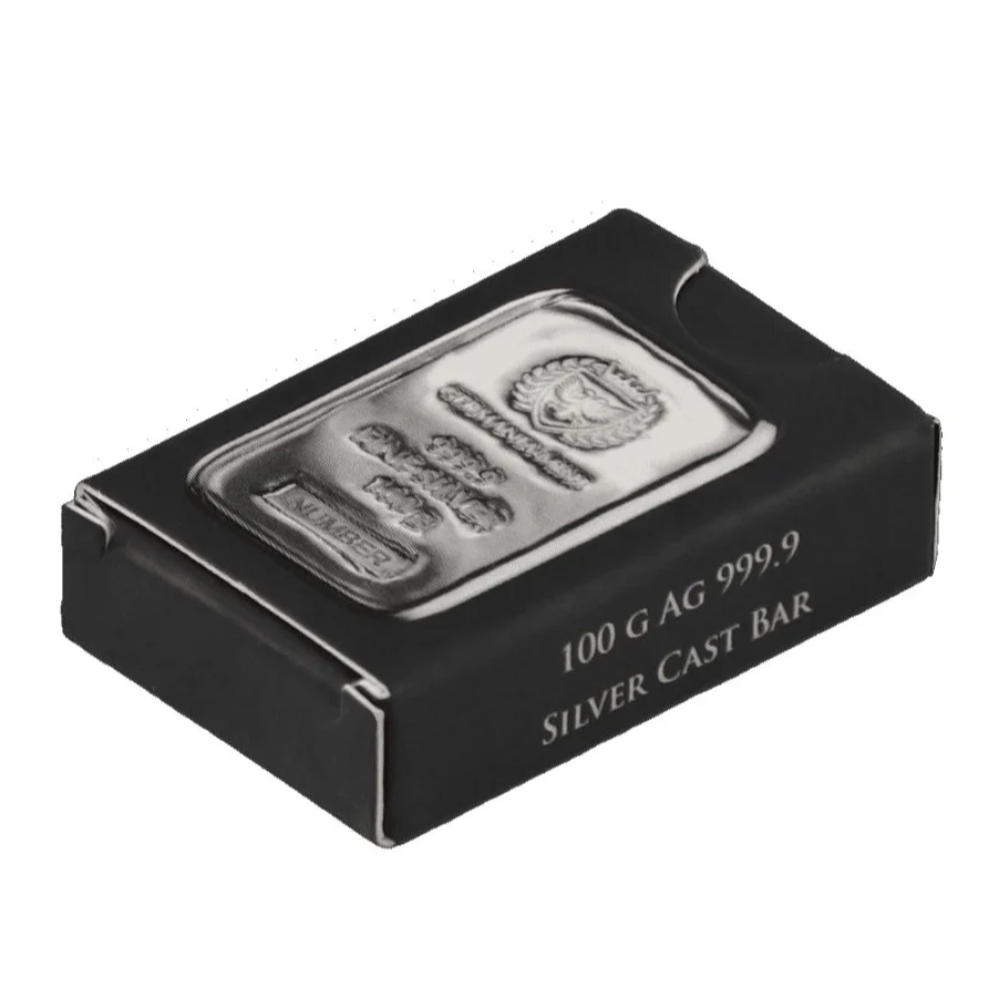 Each 100 Gram Germania Cast Silver Bar available in this product listing comes to you with its own presentation box. The bars are packaged in black presentation boxes with a viewing window that shows the obverse design field. Multiples of 20 silver bars ship together in a mint-strapped box. The bars in this series also come with a hologram element on the reverse for security purposes.